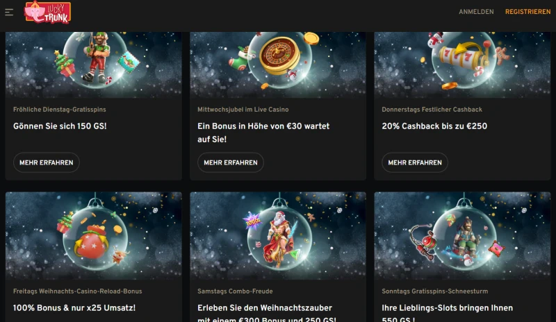 LuckyTrunk Boni wechseln zwischen wöchentlich wiederkehrenden Belohnungen und saisonalen Highlight-Kampagnen. Wenn spezielle Kalender aktiv sind, sehen Sie in der Regel eine umfassende Palette an Slots-, Live-Casino- und Cashback-Vorteilen, die die ganze Woche abdecken.