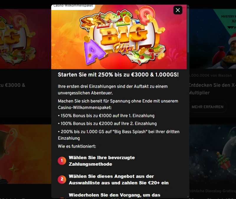 Ihre ersten drei Einzahlungen schalten ein kombiniertes Angebot im Wert von 250% bis zu €3000 + 1.000 Freispiele frei.